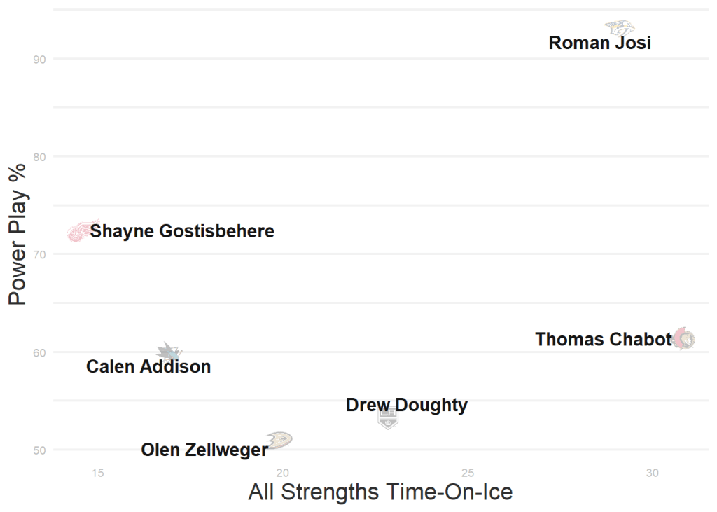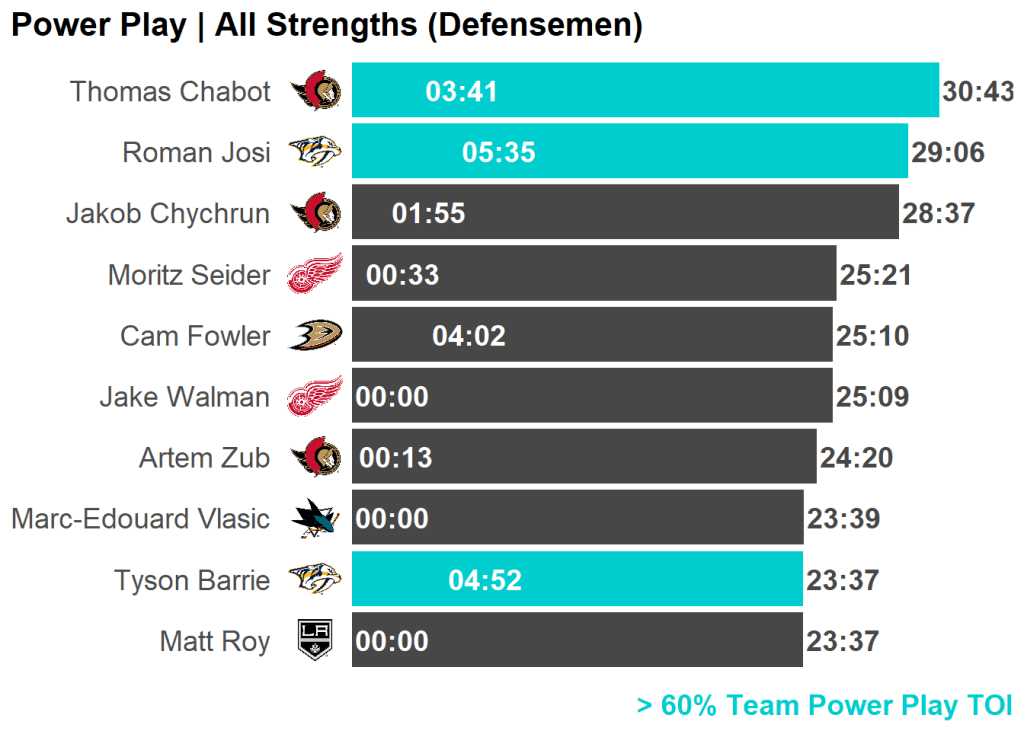 | Roman Josi | Nashville Predators | 3 | 6.19 | 5 | 0.27 |