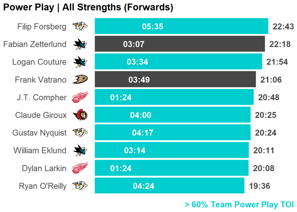 | Skater | Team | PP TOI | Percent | Last 3 GP | Difference |