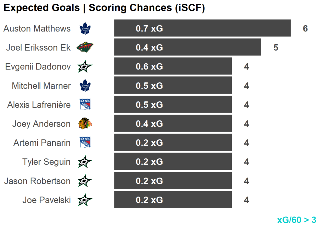 | Skater | Team | Shots | Shots/60 | Chances | xGoals |