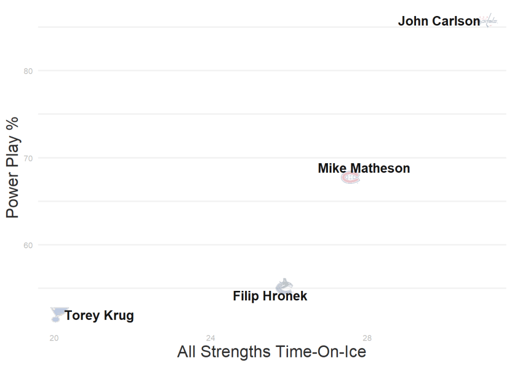 | T.J. Oshie | Washington Capitals | 03:32 | 88.3 | 61.7 | 26.6 |