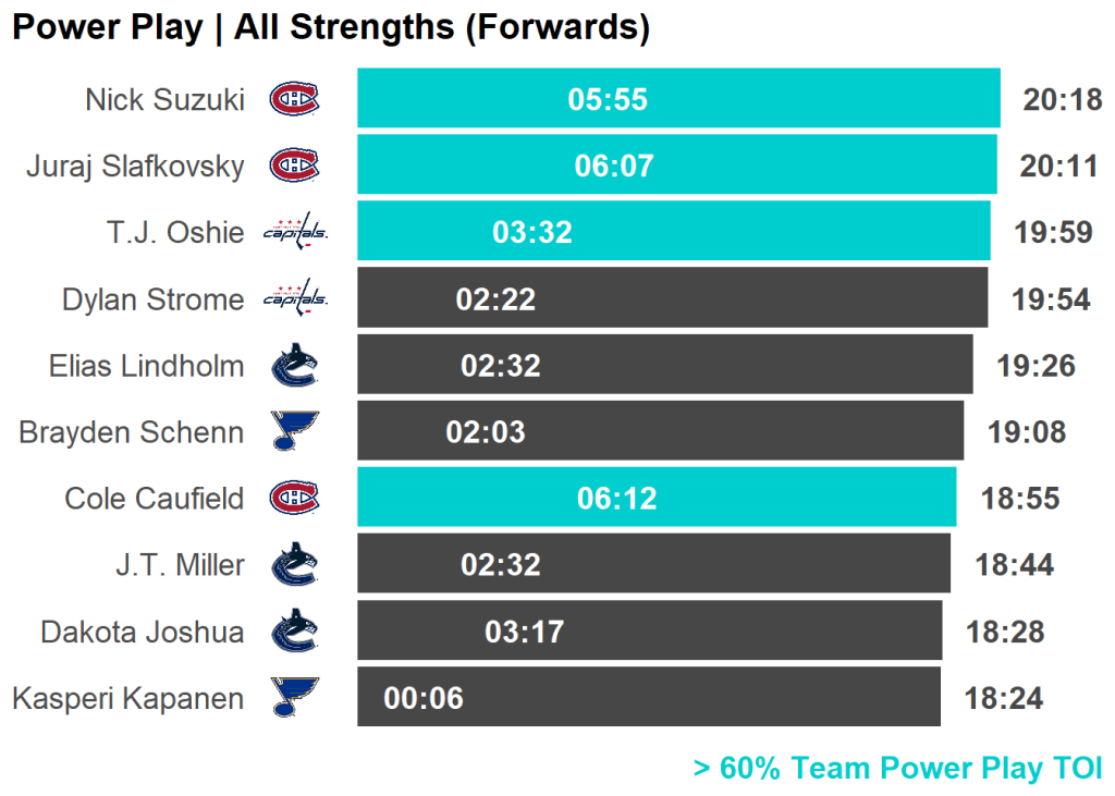 | Skater | Team | PP TOI | Percent | Last 3 GP | Difference |