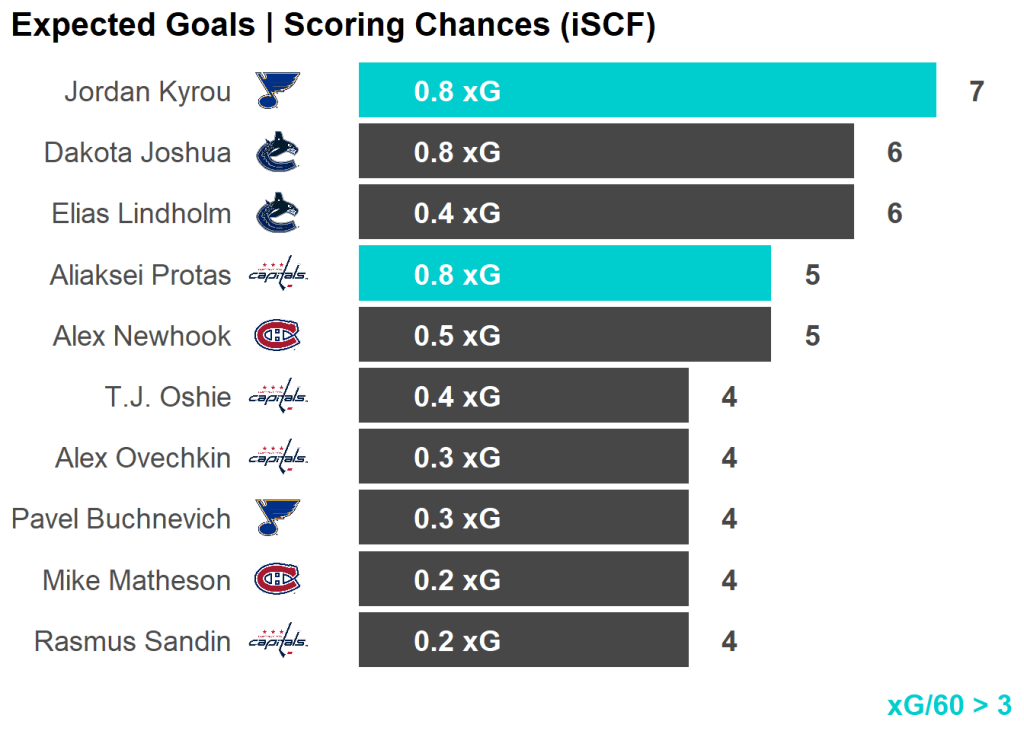 | Skater | Team | Shots | Shots/60 | Chances | xGoals |