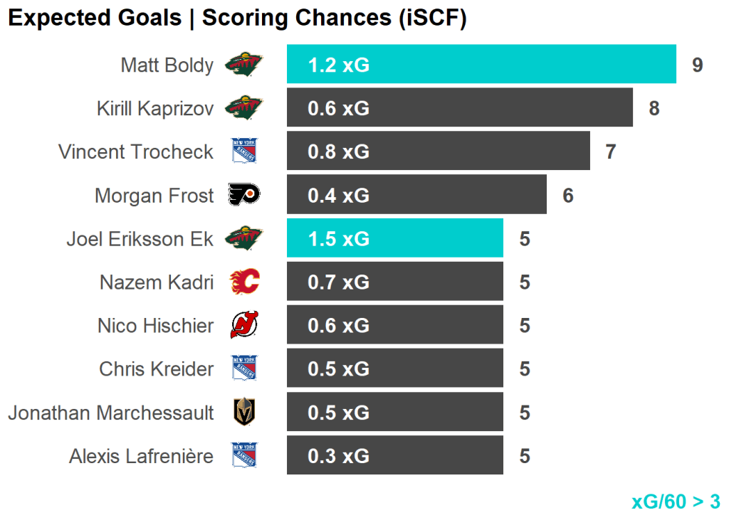 | Skater | Team | Shots | Shots/60 | Chances | xGoals |