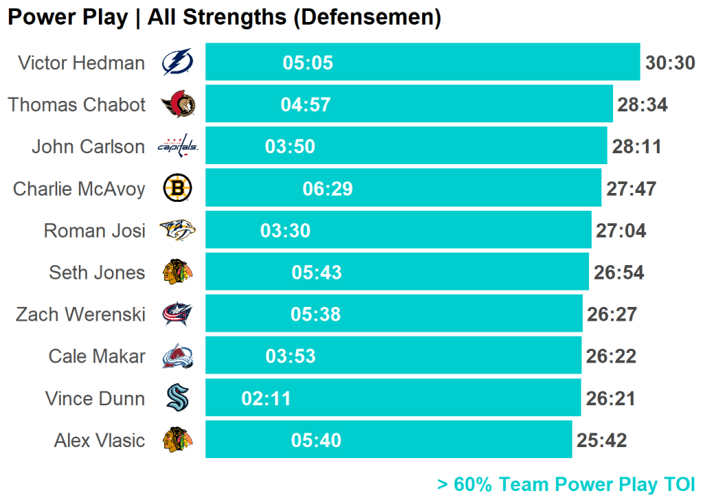 | Seth Jones | Chicago Blackhawks | 5 | 11.15 | 0 | 0.13 |