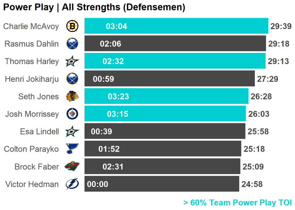 | Rasmus Dahlin | Buffalo Sabres | 5 | 10.24 | 2 | 0.34 |