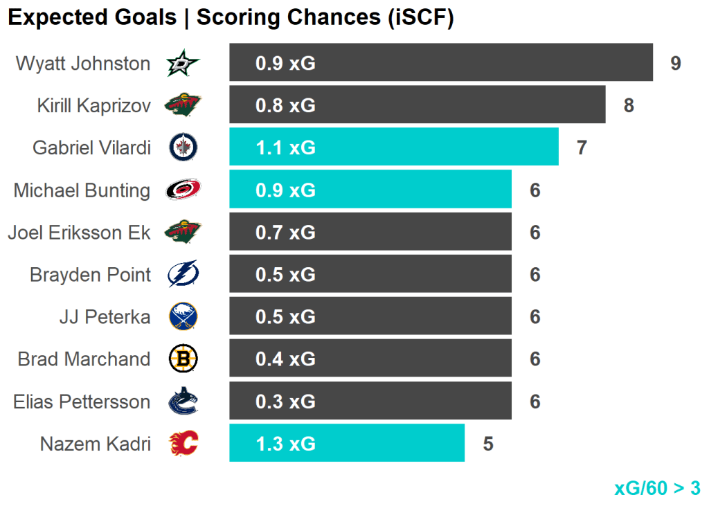 | Skater | Team | Shots | Shots/60 | Chances | xGoals |