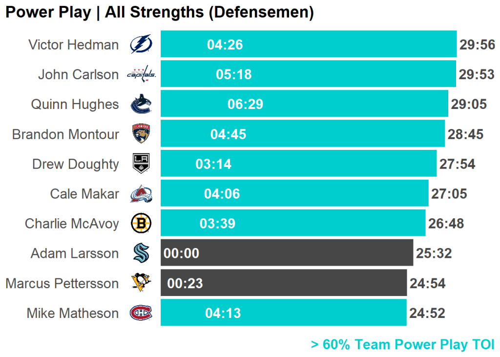 | Justin Schultz | Seattle Kraken | 4 | 16.07 | 1 | 0.13 |