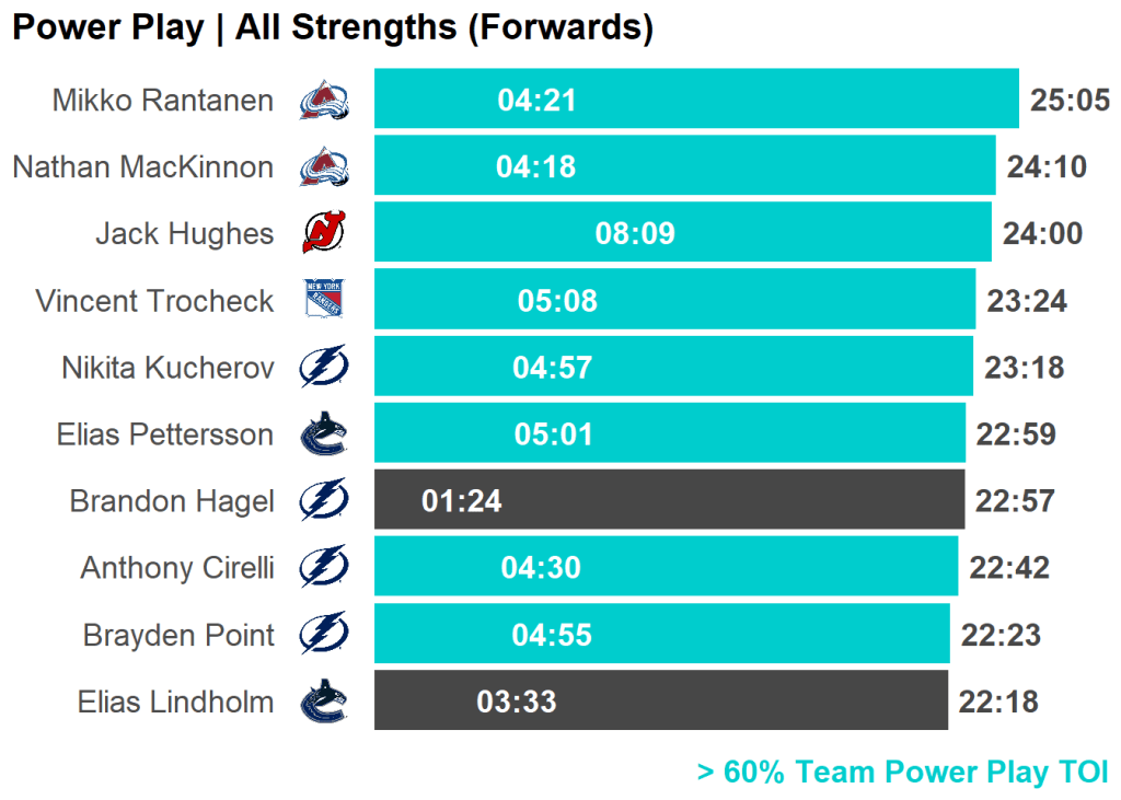 | Skater | Team | PP TOI | Percent | Last 3 GP | Difference |