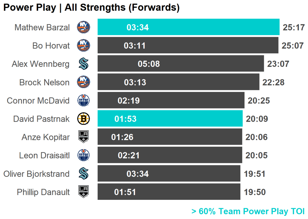 | Skater | Team | PP TOI | Percent | Last 3 GP | Difference |