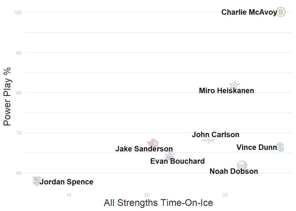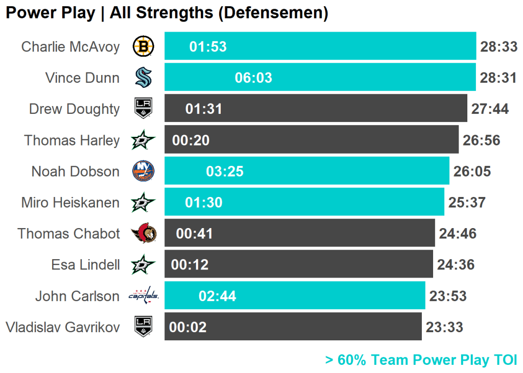 | Mason Lohrei | Boston Bruins | 00:00 | 0.0 | 21.5 | -21.5 |
