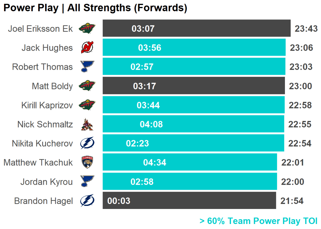 | Skater | Team | PP TOI | Percent | Last 3 GP | Difference |