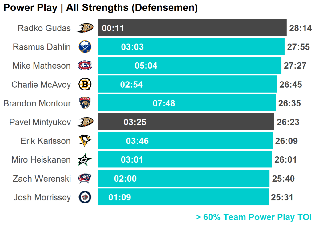 | Cam Fowler | Anaheim Ducks | 00:00 | 0.0 | 32.5 | -32.5 |