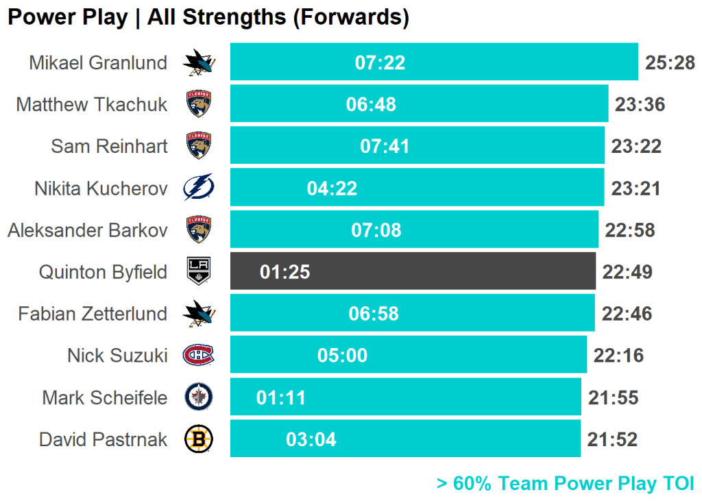 | Skater | Team | PP TOI | Percent | Last 3 GP | Difference |