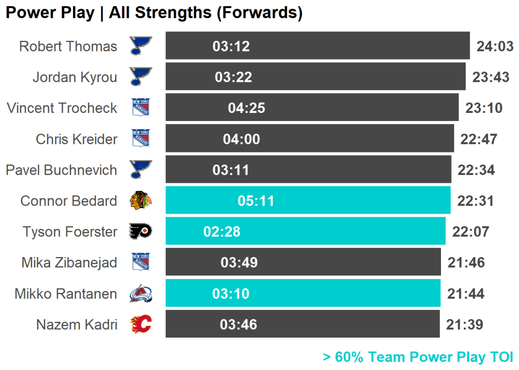 | Skater | Team | PP TOI | Percent | Last 3 GP | Difference |