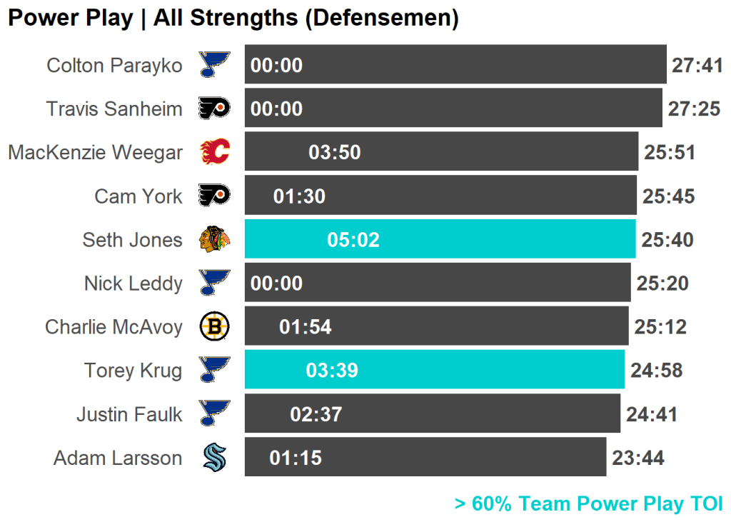| Seth Jones | Chicago Blackhawks | 3 | 7.01 | 0 | 0.08 |