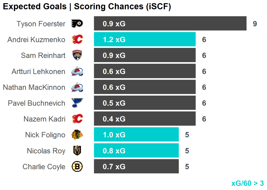 | Skater | Team | Shots | Shots/60 | Chances | xGoals |