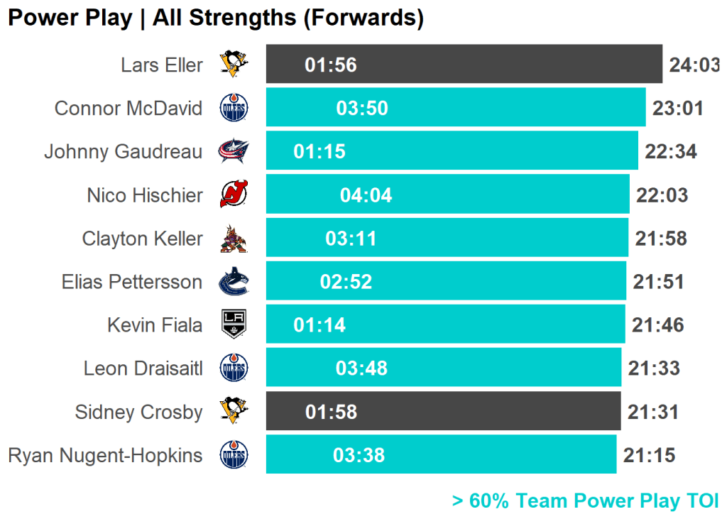 | Skater | Team | PP TOI | Percent | Last 3 GP | Difference |