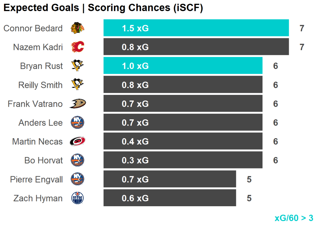 | Skater | Team | Shots | Shots/60 | Chances | xGoals |