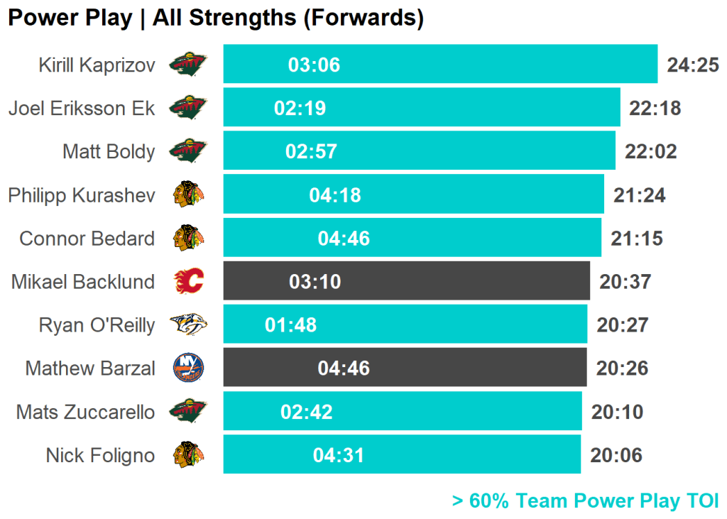 | Skater | Team | PP TOI | Percent | Last 3 GP | Difference |