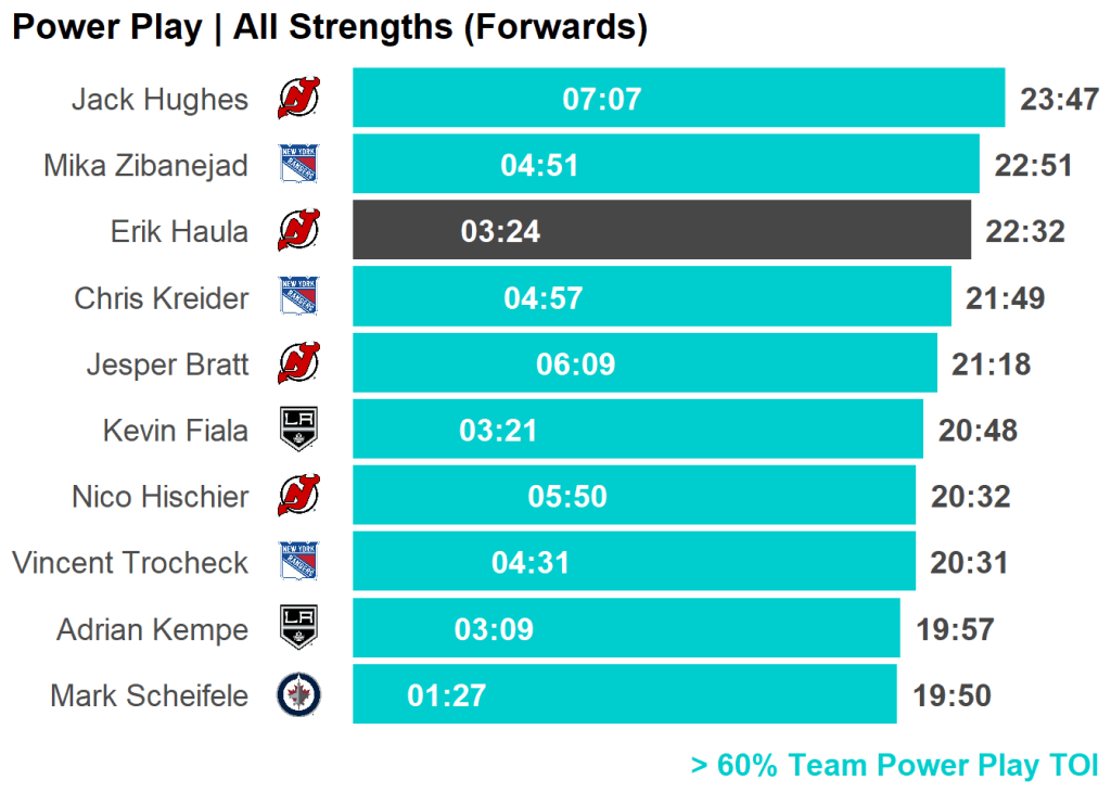 | Skater | Team | PP TOI | Percent | Last 3 GP | Difference |