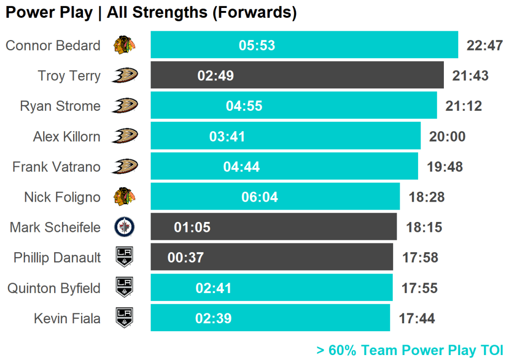 | Skater | Team | PP TOI | Percent | Last 3 GP | Difference |