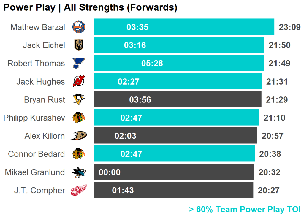 | Skater | Team | PP TOI | Percent | Last 3 GP | Difference |