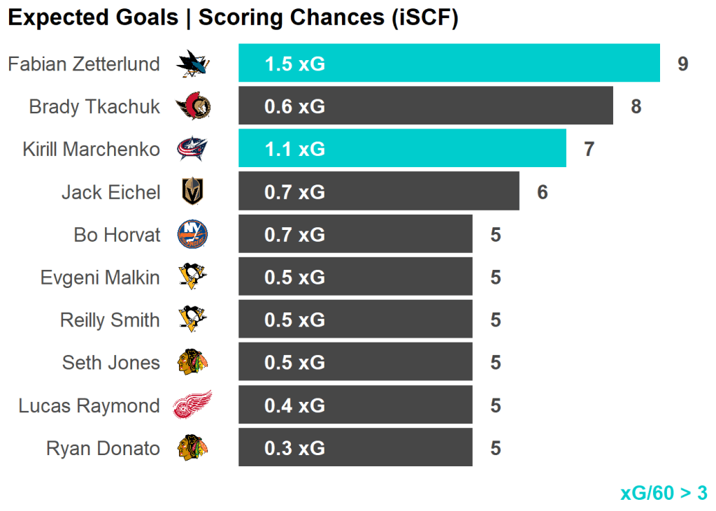 | Skater | Team | Shots | Shots/60 | Chances | xGoals |