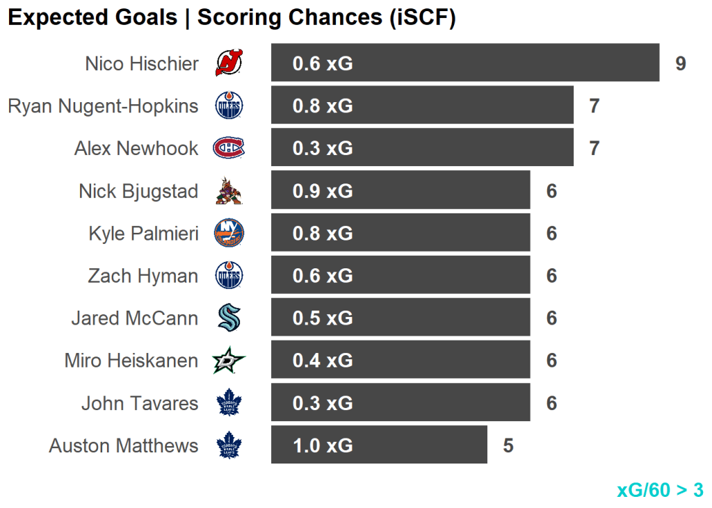 | Skater | Team | Shots | Shots/60 | Chances | xGoals |