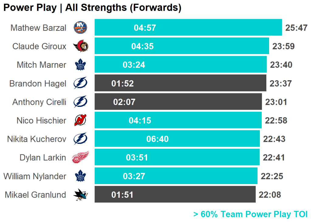 | Skater | Team | PP TOI | Percent | Last 3 GP | Difference |